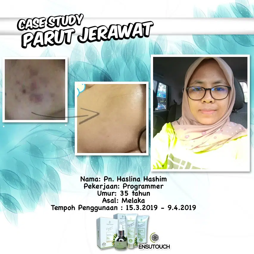 “Alhamdulillah parut jerawat pada bahagian pipi saya dah start pudar dan hilang setalah sy menggunakan ensutouch selama hampir 2 minggu. Dah bermacam-macam produk yang sy dah gunakan termasuk produk international utk hilangkan parut jerawat sy..sehingga sy terpaksa gunakan foundation utk tutup parut jerawat sy..tapi dengan ensutouch ni sy lebih yakin sebab dah tak perlu tepek foundation tebal2 lagi dah..dan yg penting sy belajar adalah..jgn sesuka hati guna kosmetik yg tiada latarbelakang kajian dan ada bahan kimia…